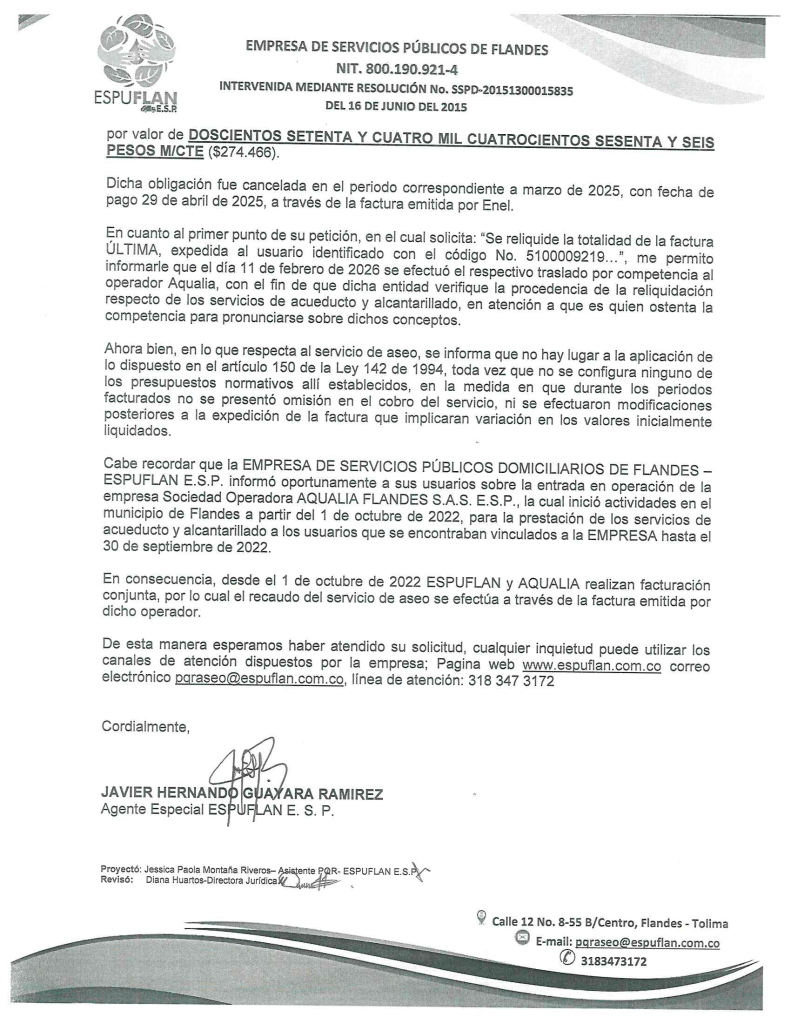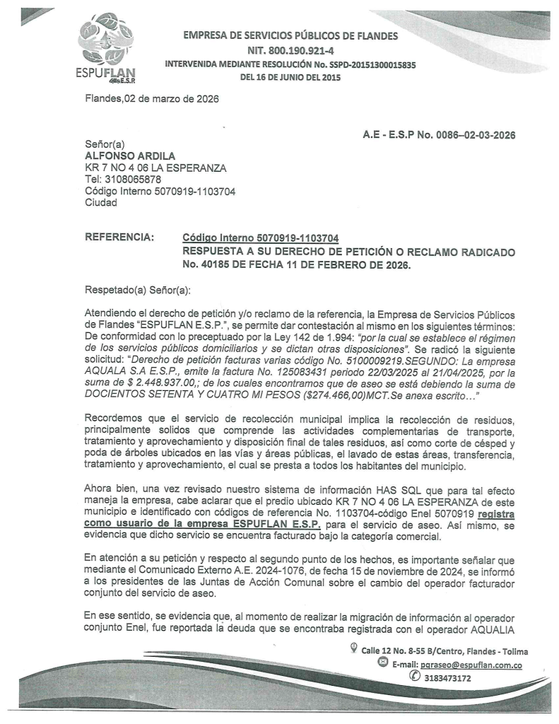 Para notificaciones judiciales y reclamaciones al correo pqraseo@espuflan.com.co