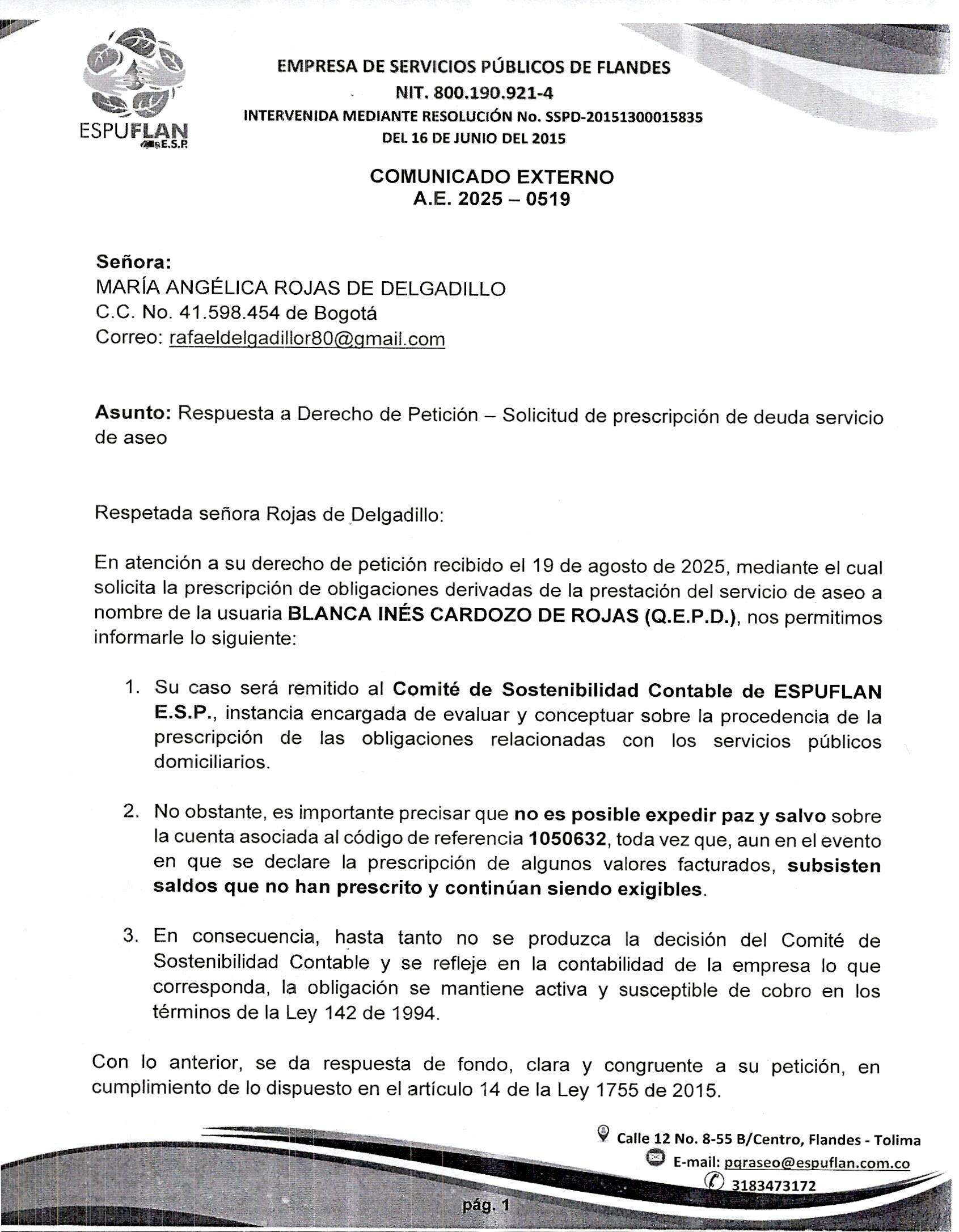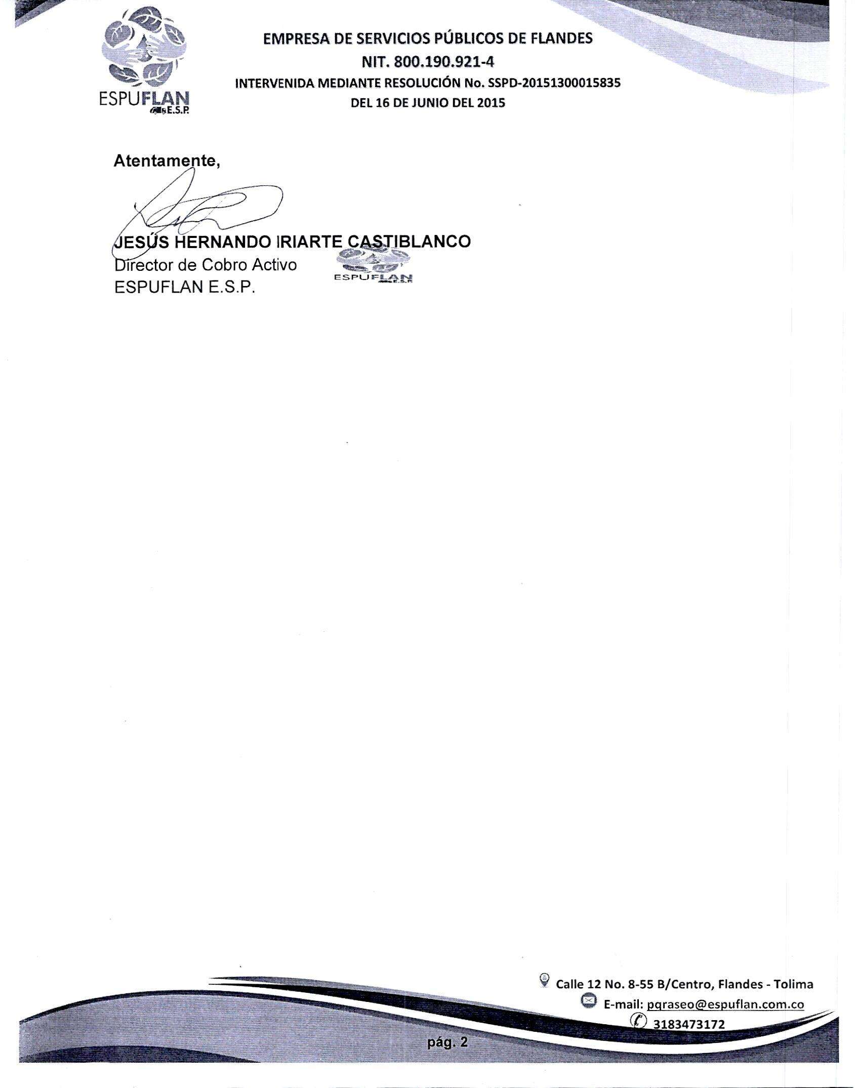 Para notificaciones judiciales y reclamaciones al correo pqraseo@espuflan.com.co